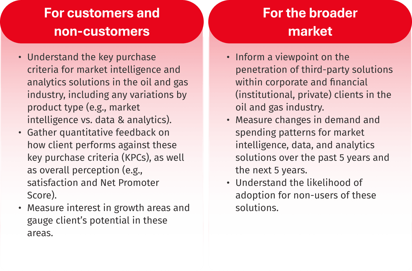 Our client wanted to conduct a survey aimed at understanding the purchase criteria, perceptions, and adoption potential for oil and gas market intelligence solutions. This survey aimed to gather insights from both current customers and non-customers to identify key factors driving purchase decisions and to measure satisfaction with current providers.