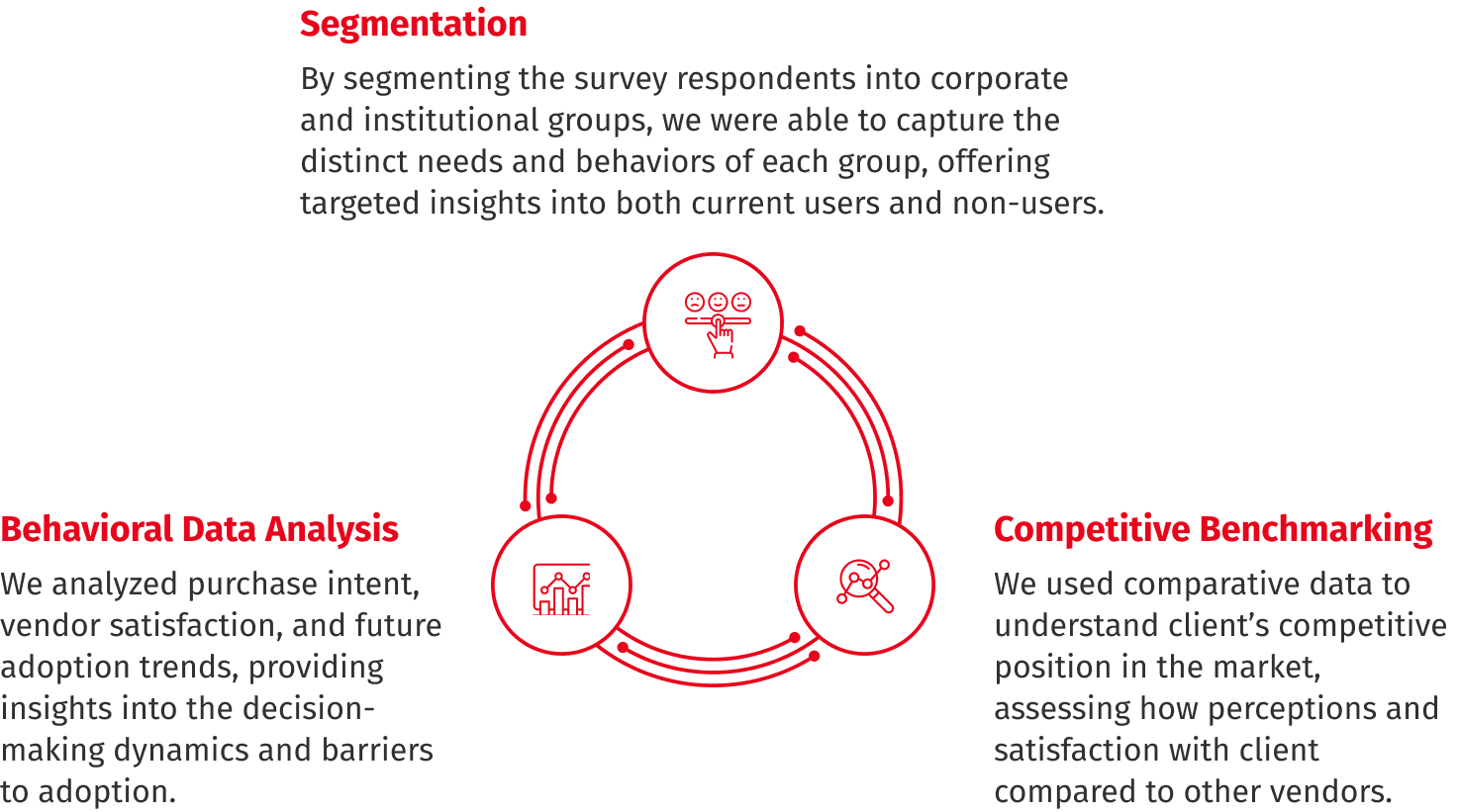 Jasper Colin's segmentation framework helped segment respondents into corporate and institutional investor groups, ensuring targeted insights into both current users and non-users of market intelligence solutions. Our competitive benchmarking process allowed us to assess client’s standing relative to other vendors in the market, while identifying areas of growth potential and areas for improvement.