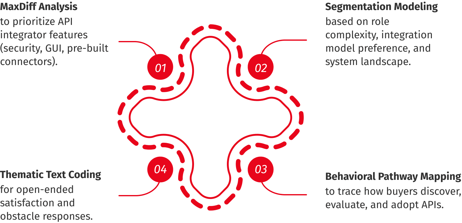 We reviewed market intelligence and past client insights into API usage trends. Initial hypotheses focused on the perceived friction between IT and Finance departments, limited in-house integration capacity, and unclear aggregator value.